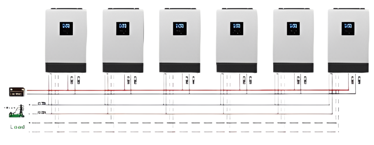 En una configuración monofásica, se pueden conectar hasta cuatro inversores en paralelo. Esta configuración aumenta la potencia total de salida, convirtiéndola en una solución ideal cuando se requiere mayor potencia para soportar múltiples dispositivos. Es una opción perfecta para usuarios que necesitan un sistema escalable que pueda crecer con sus demandas energéticas en aumento.